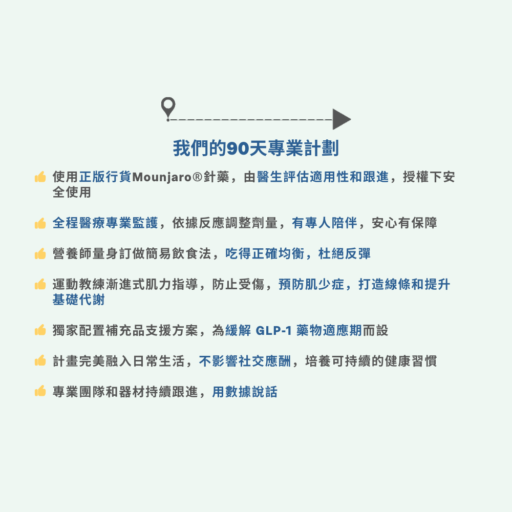 - 防止肌少症: 營養師與教練介入,配合獨家補充品,確保你減去的是脂肪而非肌肉 。