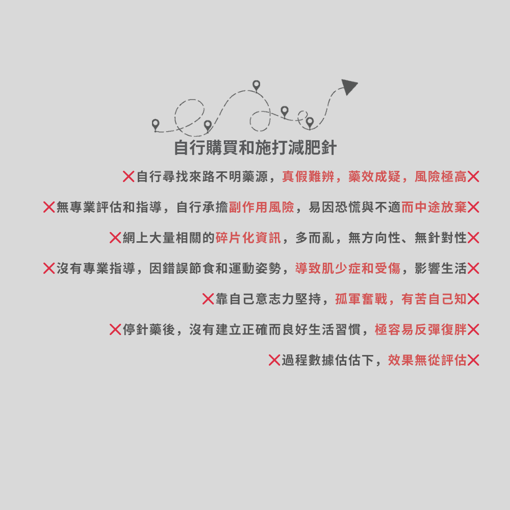- 無專業指引: 不知道何時停藥、如何停藥,一旦停針,體重往往數週內反彈。
